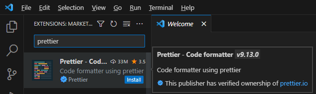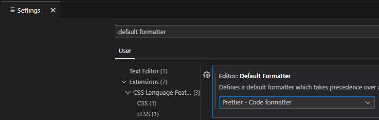 검색창에 default fomatter 검색 후 Default Formatter를 Prettier로 설정