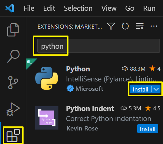 Visual Studio Code 실행 후 Extensions에서 python 검색 후 설치