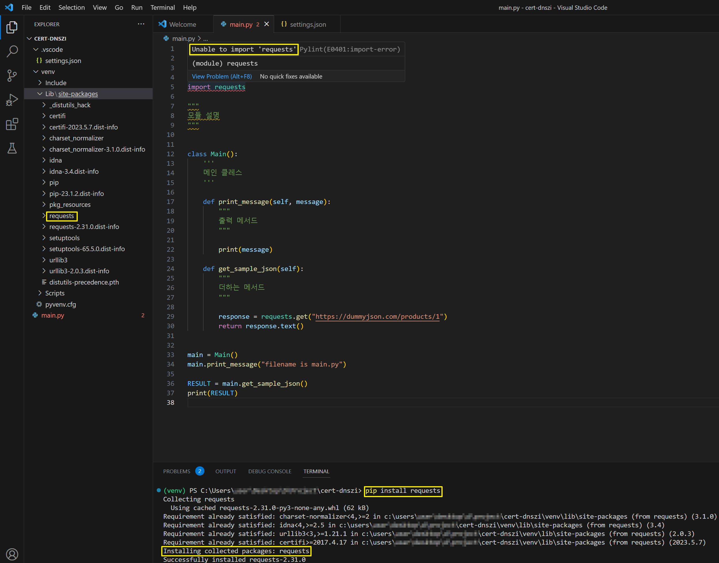 requests 라이브러리를 설치했지만 에디터 에서는 requests 라이브러리를 찾을 수 없다고 나옴