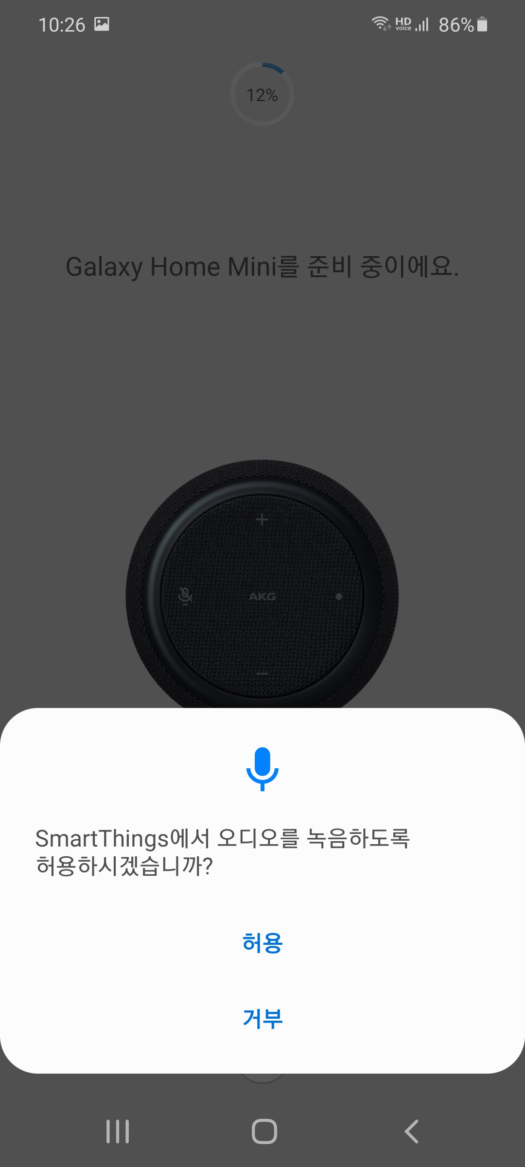 갤럭시 홈 미니 전원을 연결하고, SmartThings 앱을 실행한다.