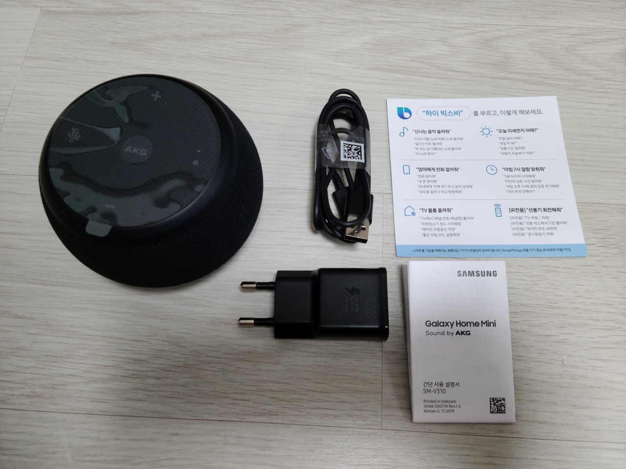 박스를 뜯으면 구성품으로 갤럭시 홈 미니 본체, 마이크로 5핀 USB 케이블, 마이크로 5핀 전원 어댑터, 사용 설명서가 들어있다.
