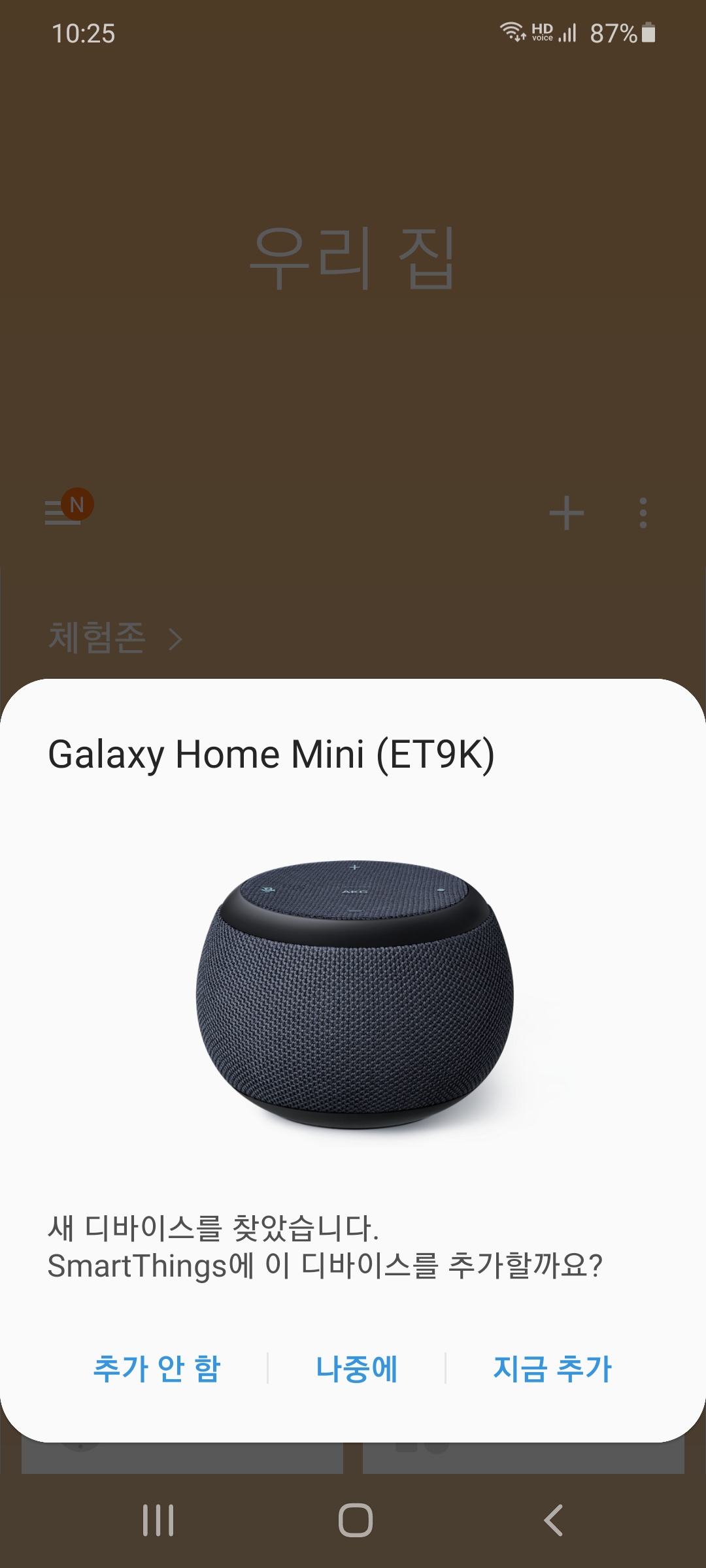 SmartThings 앱이 열리고, Galaxy Home Mini를 자동 인식하여 디바이스를 추가할 것인지 물어본다.
