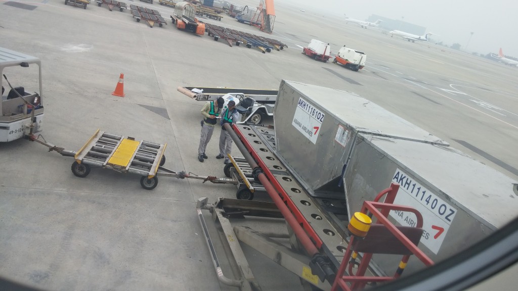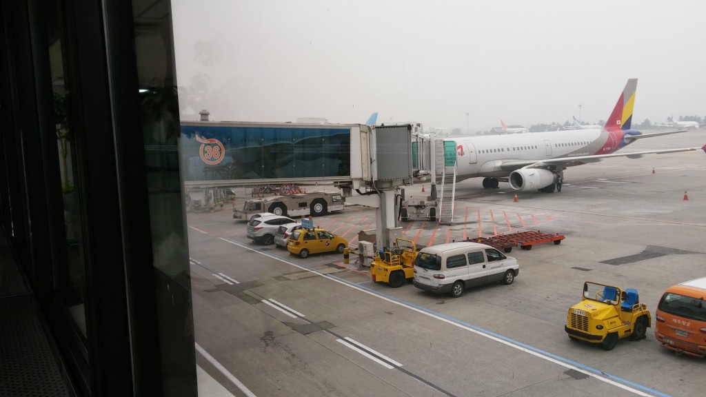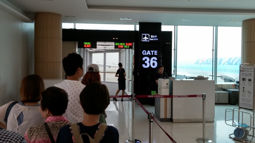 시간이 되서 OZ1125편을 타기 위해 36번 게이트에 줄을 섰습니다. 오른쪽에 보이는 대한항공 비행기가 아니고, 보이지는 않지만 왼쪽에 있습니다.