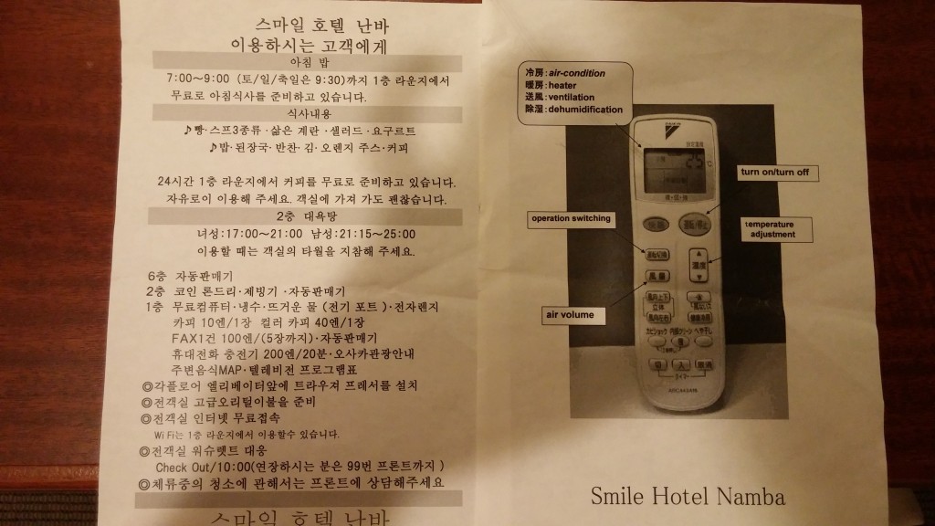 한글로된 간단 안내문을 줬습니다. 잘 보시면 녀(여)성 이라는 오타가 있는데 어디서 본 블로그에서도 똑같이 오타가 있었는데 아직까지 안고쳐져 있었습니다. 아마 모르는게 아닐까… 그래서 숙소에서 나올때 오타라고 알려줬습니다. :)
