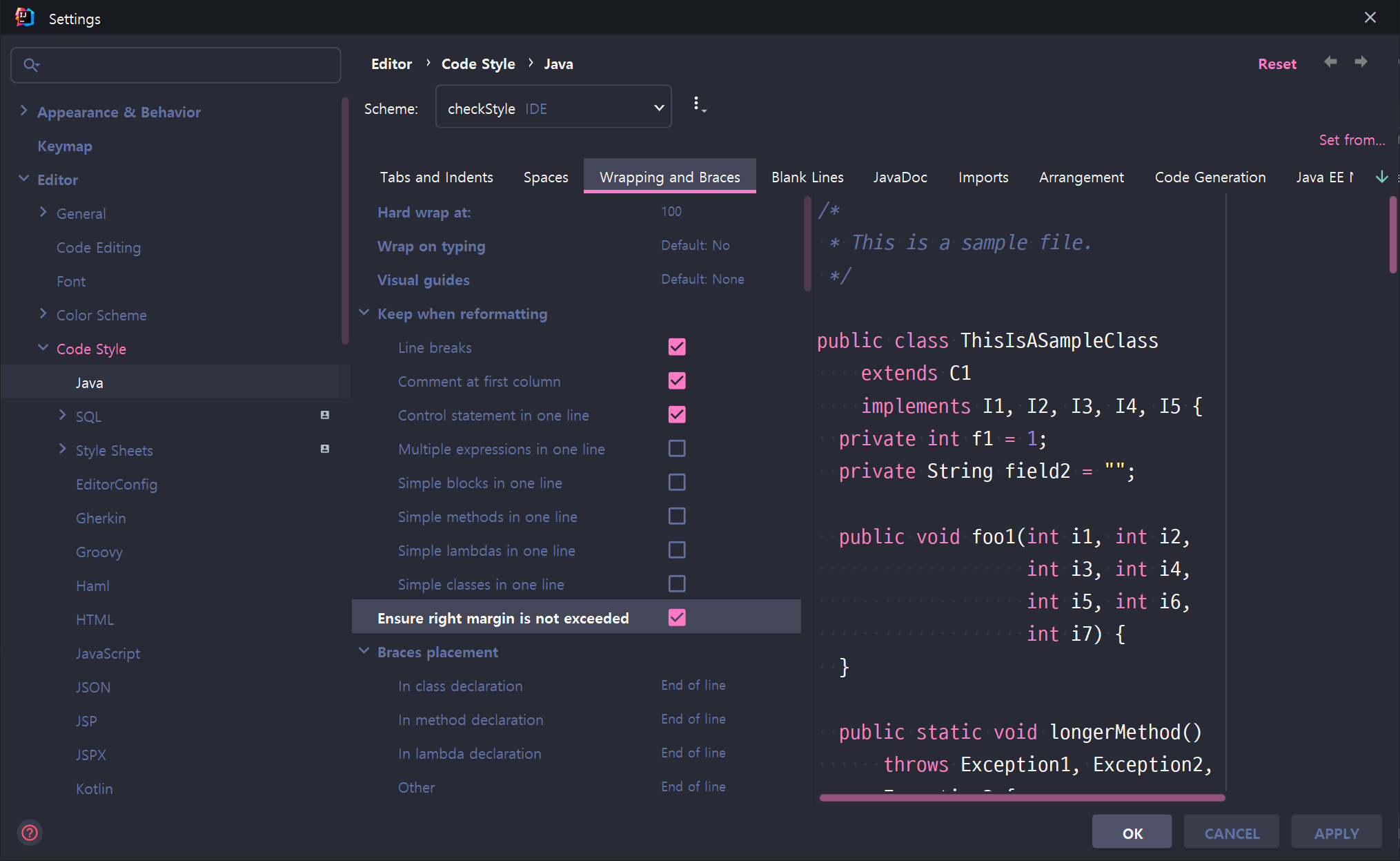 Settings - Editor - Code Style - Java - Wrapping and Braces - Ensure right margin is not exceeded 체크 - OK